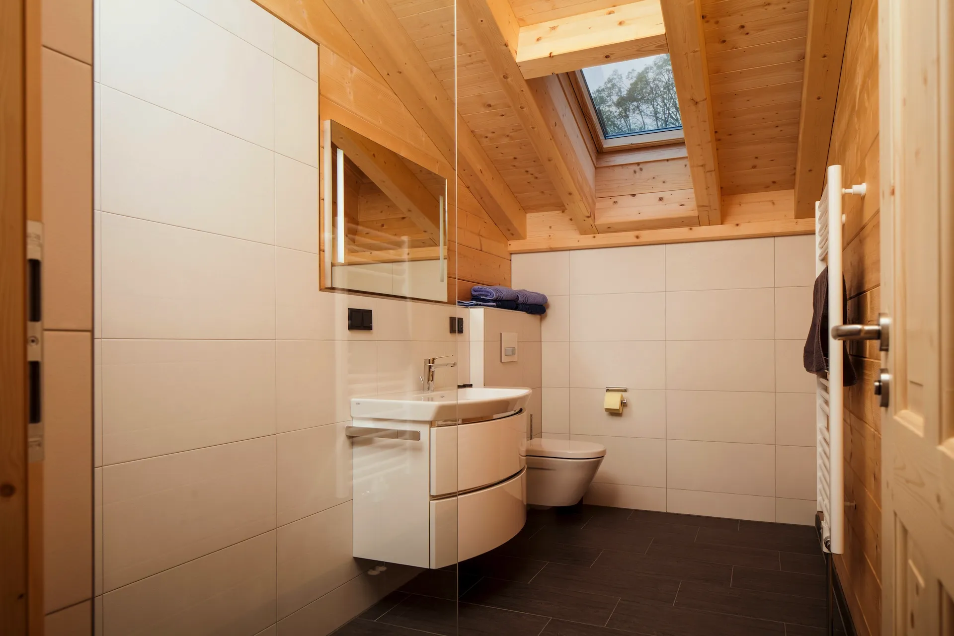 Badezimmer mit bodenebener Dusche mit Waschtisch, WC, Handtuchwärmer Masterbad mit Badewanne/ bodenebener Dusche.